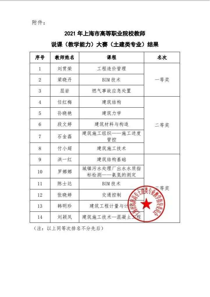 “2021年上海市高等职业院校教师说课(教学能力)大赛(土建类专业)”于2021年11月27日在上海城建职业学院举行,共30名来自多所职业院校的老师参加现场决赛。经过层层角逐,专家评审,上海中侨职业技术大学建筑工程学院刘颖凤老师喜获三等奖。