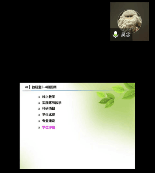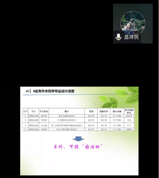 接下来,由建筑工程专业主任吴念对3-4月份线上教学、实践环节教学、科研项目、学生比赛、专业建设进行回顾总结,并对学院学位评估所需材料提出要求。随后,每一位专业课老师就对教育部协同育人项目、创新创业大赛报名、以及4位专升本同学毕业设计进度依次进行汇报交流。其次,教学秘书斯张琳、实验员陈诞冬、夏美就疫情在家办公情况做了简单汇报。然后,辅导员就日常组织学生核酸检测、钉钉每日健康打卡、学生管理等工作进行汇报。副院长昌祥民就目前线上教学存在的问题,提出建议,希望大家齐心协力助力线上教学有序进行。