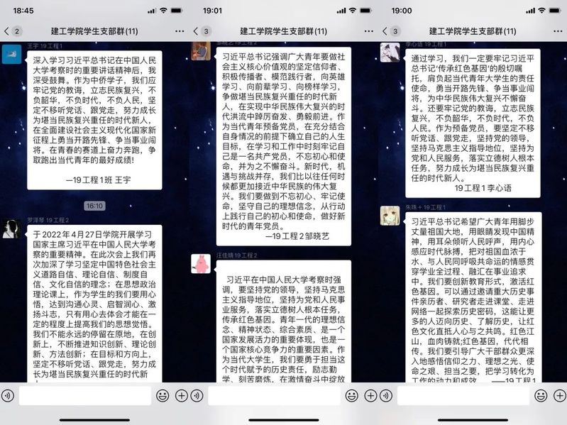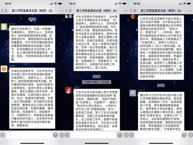 学生党员们表示总书记的讲话让我们对新时代青年的历史责任有了更深的认识。我们应该时刻牢记自己身上的责任,要把自己今天的学业、明天的事业同国家的需要、人民的需求紧密联系起来,肩负起建设社会主义现代化强国、实现中华民族伟大复兴的历史使命。贡献建工学子的青春力量。