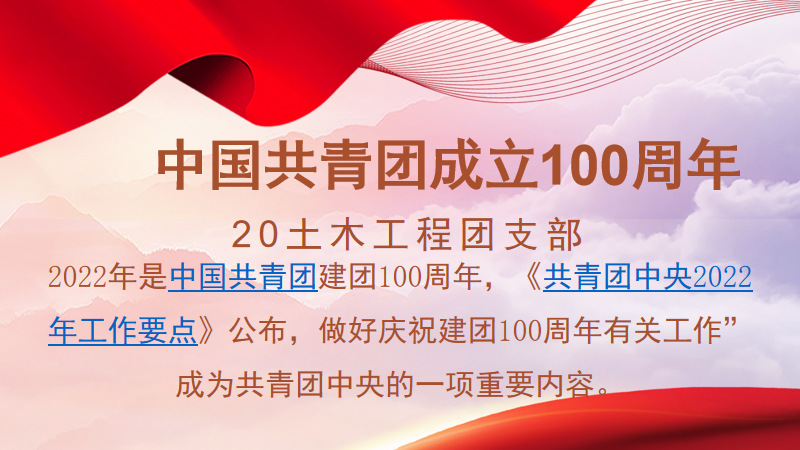 2022年是中国共产主义青年团建团100周年。100年的风雨兼程、100年的砥砺前行,一代又一代的共青团员在岗位上默默付出,在共青团精神的熏陶下,我们不忘初心、牢记使命,为实现中华民族的伟大复兴中国梦而奋发图强。中国共青团在中国共产党领导下不断发展壮大,始终站在革命斗争的前列。作为新时代的共青团员,我们要争做有理想、有本领、有担当的时代青年,在新时代新征程上留下无悔的奋斗足迹,擦亮青春底色