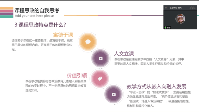 接下来,徐妍老师分享了自己对课程思政的总结,从对课程思政的认识改变、课程思政的自我思考、课程思政的教学融入、课程思政规划与设计四个方面来展开。她指出,要推动全部课程融入德育元素,将课程思政元素具体到教育教学的各个环节。只有让专业课程中的思政元素从本课程中自然延伸,与专业知识、专业精神相得益彰、合而为一,才能真正做到“思政有深度、育人有温度”。通过分享,大家纷纷表示对思政元素融入课程的理解更加深入,进行教学设计时也更加灵活变通。