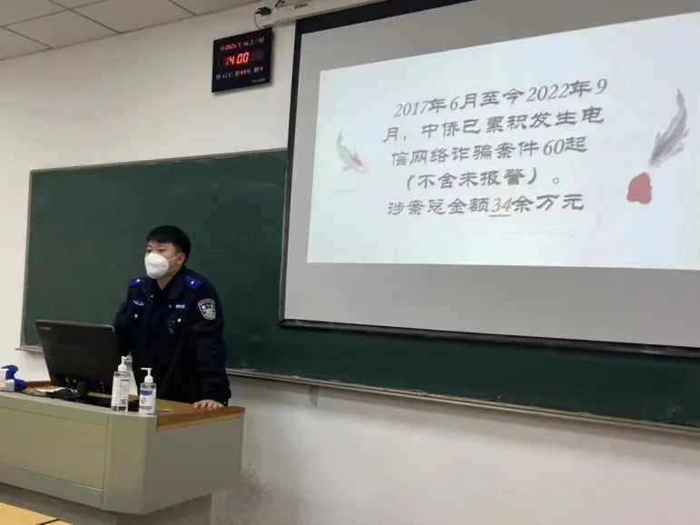 首先,中侨平安驿站反诈宣传队队长高敏建结合2022年9月至今,校内发生的电信网络诈骗,说明了为什么要进行反诈防诈宣传,系统地对类似骗局进行了解读。接着,介绍了有关电信网络诈骗的相关信息,让同学们真正的明白了身边的一些电信网络宣传广告的虚假性和欺骗性,帮助同学们今后遇到类似骗局时能够采取合理措施。最后强调了反诈防诈的必要性和重要性。