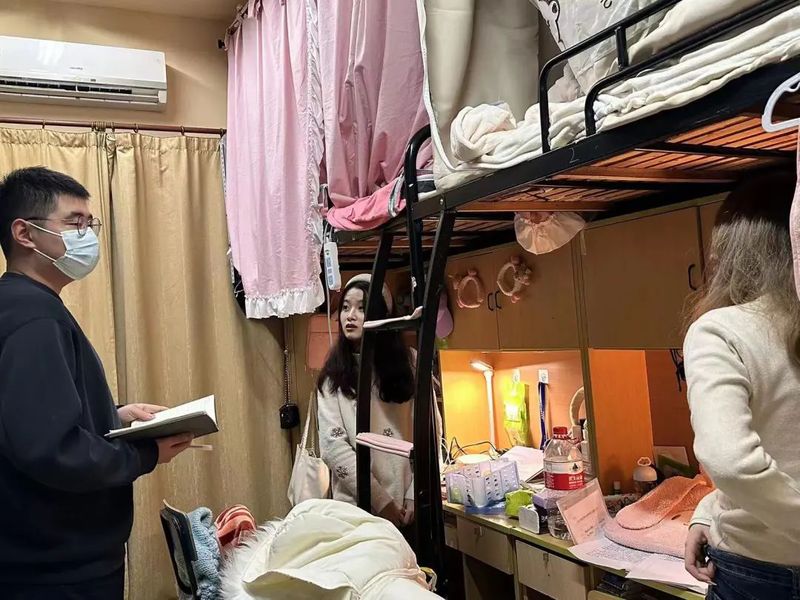 在查寝过程中,老师关心学生们的住宿情况,并强调不要在宿舍大功率用电器,以防宿舍出现安全事故。同时提醒学生们,天气虽然转暖,但是早晚依旧凉意较重,提醒学生不要感冒、发烧,预防甲流,注意自己的身体健康。