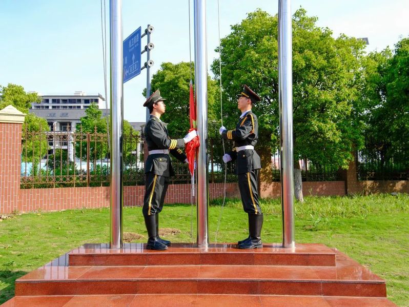 参与仪式的同学们排列成整齐的方阵,庄严肃穆地等待五星红旗的冉冉升起。国旗队成团迈着整齐的步伐,昂首挺胸,神采奕奕地向旗台走去。在场师生们心中油然而生对国旗的敬意。