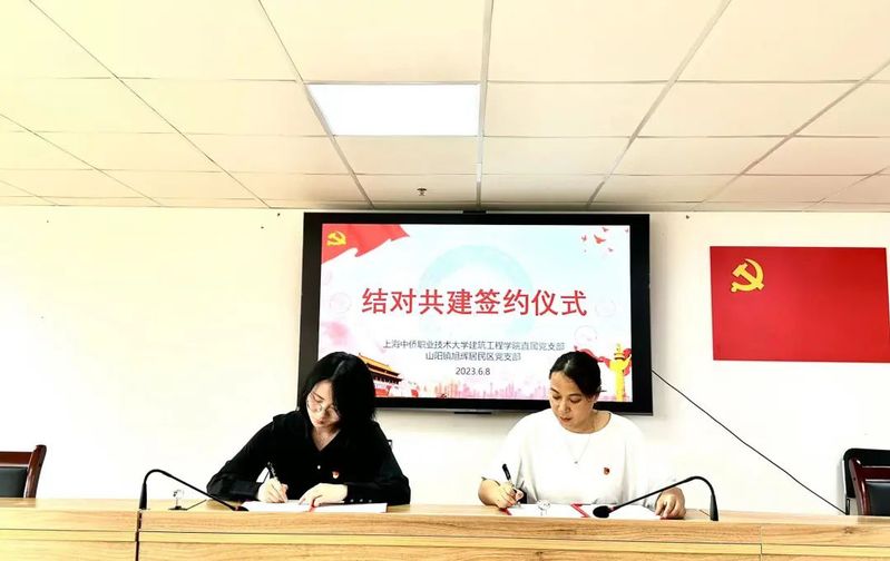 2023年6月8日,上海中侨职业技术大学建筑工程学院直属党支部与山阳镇旭辉居民区党支部举行了党支部结对共建签约仪式。建筑工程学院直属党支部副书记岳建梅、组织委员孙靖、宣传委员张桐源、入党积极分子代表斯张琳,和山阳镇旭辉居民区党支部书记黄翠燕及山阳镇旭辉居民区党支部的党员同志们共同出席本次签约仪式。