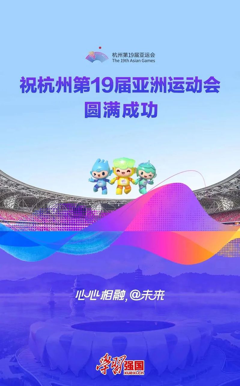 风起东方,钱江潮涌,弦歌浩荡。今夜,来自良渚古城遗址的“文明之光”,点燃象征亚洲大团结的体育之火,源远流长的中华文明与激情洋溢的体育盛会交相辉映。让我们以梦想为帆、以奋斗作桨,共绘亚运新的画卷、共创亚洲美好未来。