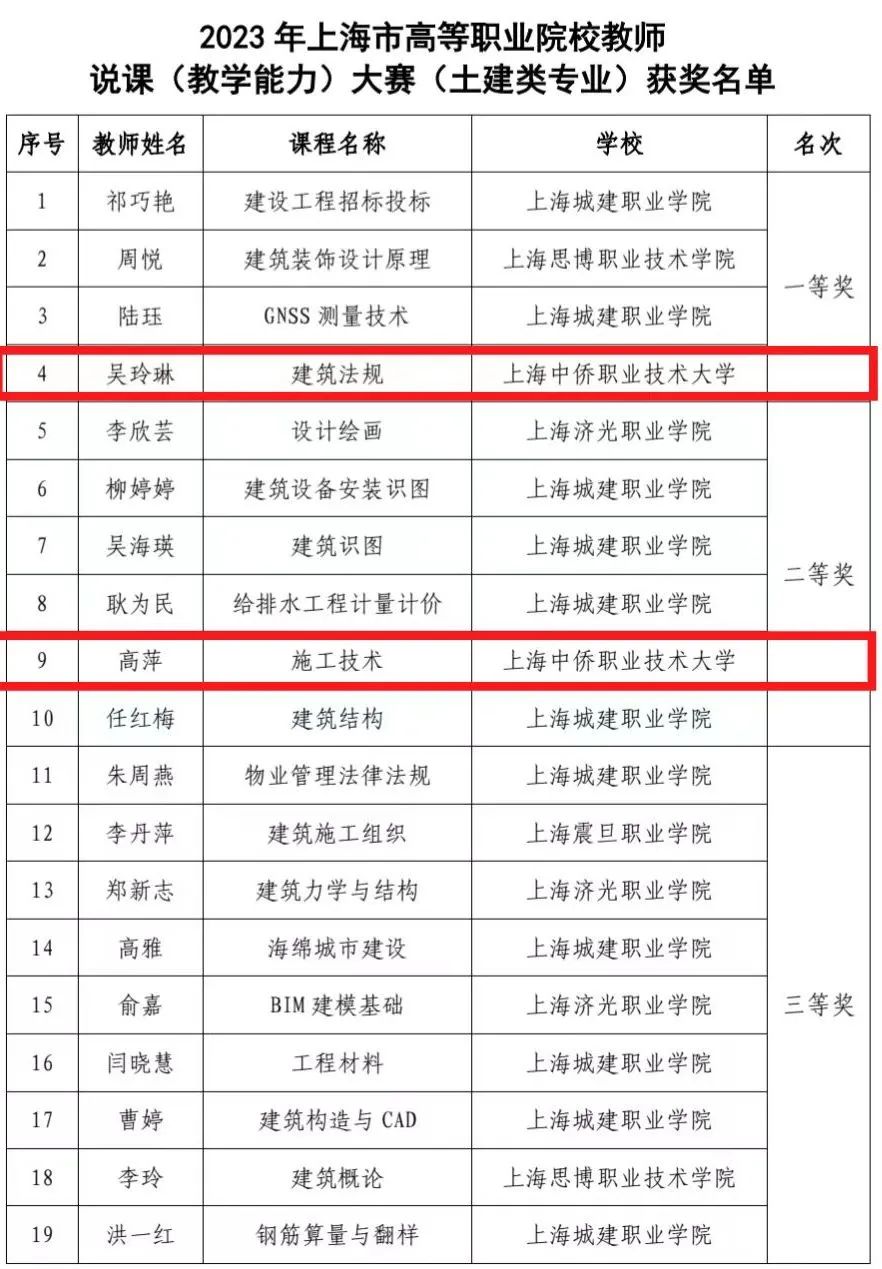 2023 年上海市高等职业院校教师说课(教学能力)大赛(土建类专业)”于 2023 10 29 日在上海城建职业学院顺利举行。共 19 名教师报名参赛,经过专家评审,上海中侨职业技术大学建筑工程学院吴玲琳老师喜获一等奖、高萍老师喜获二等奖。