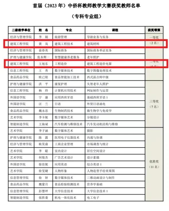 根据《首届 (2023年)“中侨杯”教师教学技能大赛方案》,经二级教学单位 (专业) 初赛遵选,学校组织决赛 (专家课堂听课、评阅课程教学大纲与教案、AOL 实施情况、学生评教等方式) ,在此次首届 (2023年)“中侨杯”教师教学技能大赛中建筑工程学院令永强老师的《建筑工程施工技术》课程喜获本科专业组二等奖、黄岚老师的《建筑材料》课程荣获专科专业一等奖、王旭东老师的《建筑工程造价电算》课程荣获二等奖。