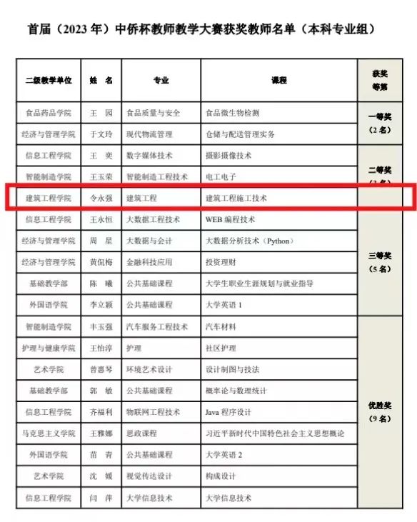 根据《首届 (2023年)“中侨杯”教师教学技能大赛方案》,经二级教学单位 (专业) 初赛遵选,学校组织决赛 (专家课堂听课、评阅课程教学大纲与教案、AOL 实施情况、学生评教等方式) ,在此次首届 (2023年)“中侨杯”教师教学技能大赛中建筑工程学院令永强老师的《建筑工程施工技术》课程喜获本科专业组二等奖、黄岚老师的《建筑材料》课程荣获专科专业一等奖、王旭东老师的《建筑工程造价电算》课程荣获二等奖。