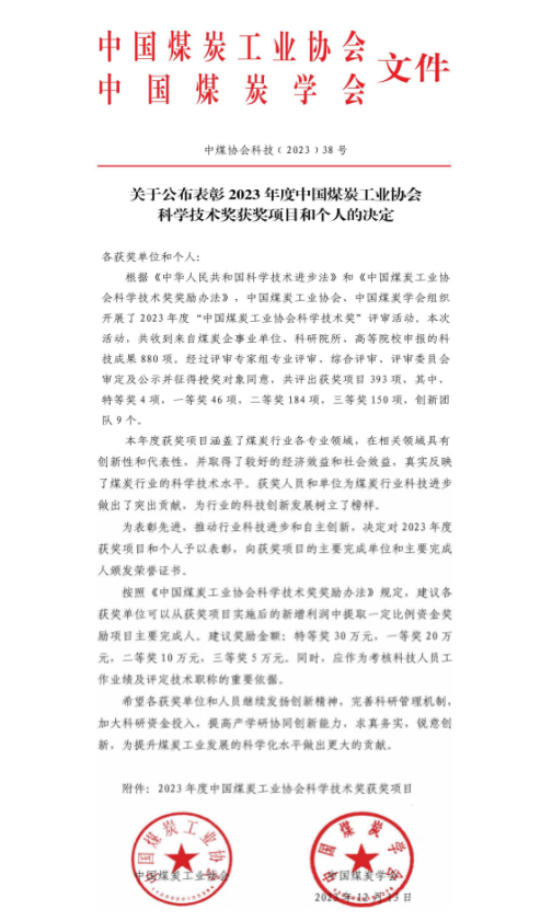 根据《中华人民共和国科学技术进步法》和《中国煤炭工业协会科学技术奖奖励办法》,中国煤炭工业协会、中国煤炭学会组织开展了2023年度“中国煤炭工业协会科学技术奖”评审活动。本次活动,共收到来自煤炭企事业单位、科研院所、高等院校申报的科技成果880项。经过评审专家组专业评审、综合评审、评审委员会 审定及公示并征得授奖对象同意,共评出获奖项目393项,其中,建筑工程学院院长朱小利参与团队的《千米强矿压深井解放层开采卸压机制及效果评价研究》荣获2023年度中国煤炭工业协会科学技术奖获奖项目二等奖。