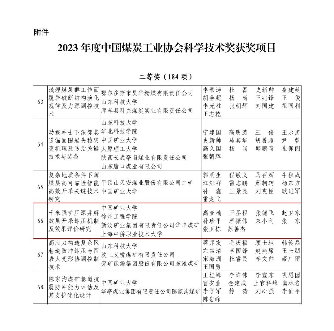 根据《中华人民共和国科学技术进步法》和《中国煤炭工业协会科学技术奖奖励办法》,中国煤炭工业协会、中国煤炭学会组织开展了2023年度“中国煤炭工业协会科学技术奖”评审活动。本次活动,共收到来自煤炭企事业单位、科研院所、高等院校申报的科技成果880项。经过评审专家组专业评审、综合评审、评审委员会 审定及公示并征得授奖对象同意,共评出获奖项目393项,其中,建筑工程学院院长朱小利参与团队的《千米强矿压深井解放层开采卸压机制及效果评价研究》荣获2023年度中国煤炭工业协会科学技术奖获奖项目二等奖。