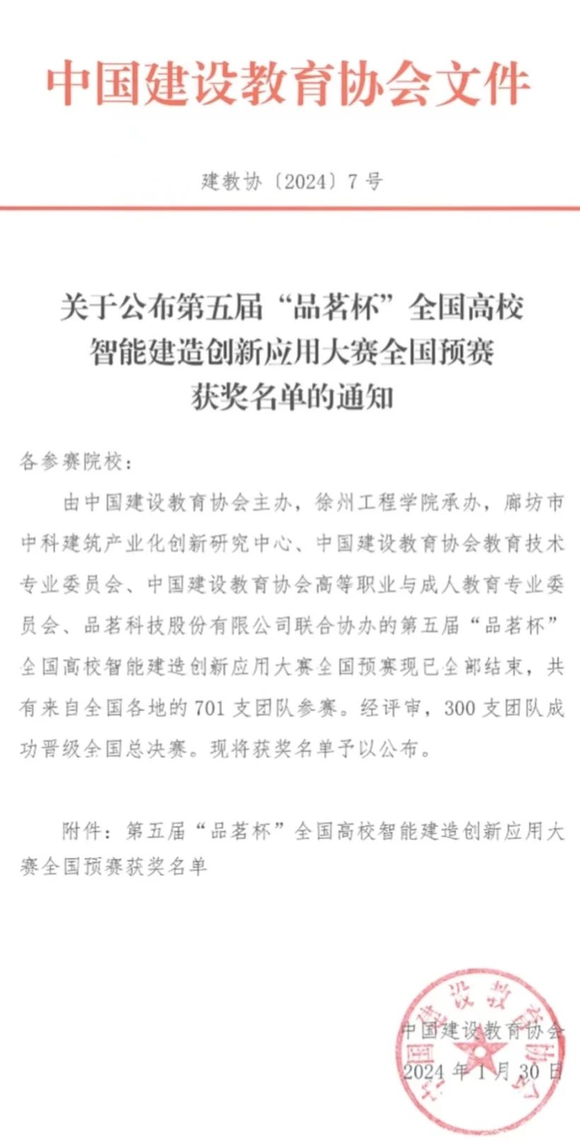 此次比赛,由建筑工程学院22级建工本科2班张红达同学,22级建工本科1班的郑皓文、黄先浩、王嘉奕、荣琳同学,共同组成“万事佳队”,于第五届“品茗杯”全国高校智能建造创新应用大赛全国预赛中赛项III-数字化施工方案设计中荣获一等奖。