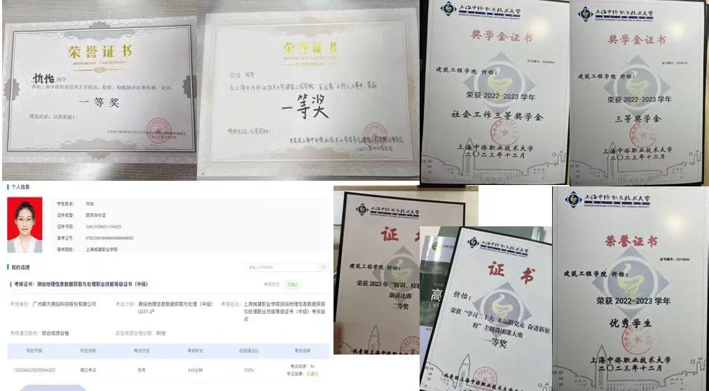 在校期间,汤文钦同学期末优异成绩获得学校二等奖学金,并积极考取计算机一级证书、“1+X测绘地理信息数据获取与处理”中级证书,积极参加学校组织的各项活动,在学校举办的运动会中,跳远荣获“第二名”的优异成绩。