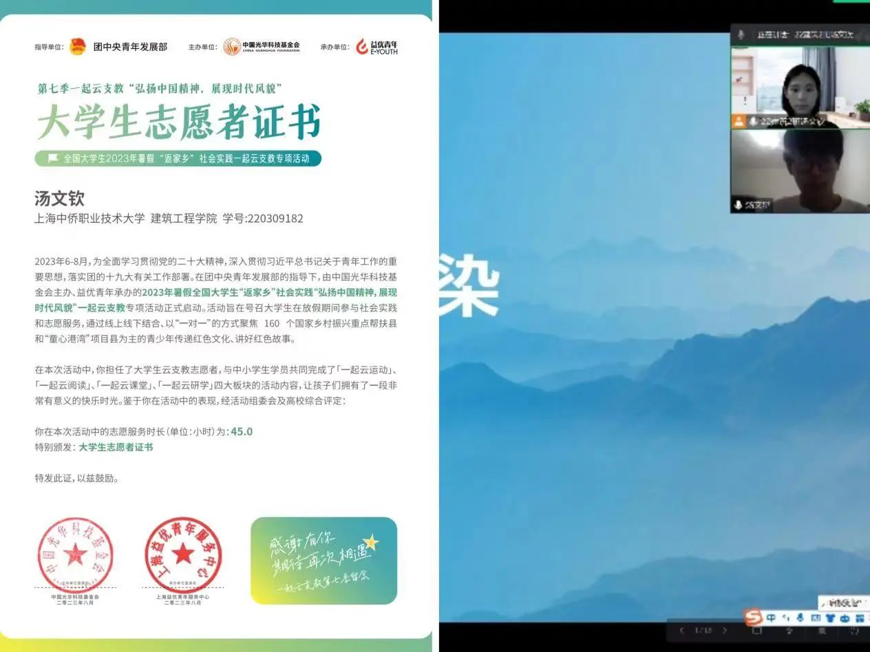 在社会实践上,汤文钦同学热爱公益活动,积极参与社会实践。她在暑假参加了“云课堂”公益活动,并获得合格证书。参加社区的志愿者服务活动,她在活动中学会如何与他人合作和沟通,感受到助人为乐的快乐,锻炼能力,更加关注社会问题。在此后,她将积极投身于社区志愿服务活动当中,为社会发展贡献青春力量。