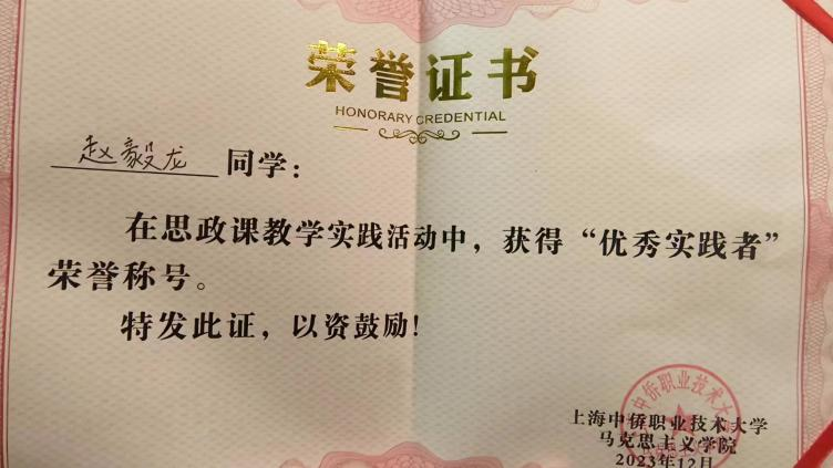 在活动方面,赵毅龙同学以多参加实践为核心目标,跟随学院参加上海市金山区张堰镇鲁堰村乡村振兴活动,并负责撰写实践报告。跟随学院共同参加了一大会址,七大会址,世界技能博物馆等有助于提高自身思想和知识的景点,并撰写个人心得体会,以团体单位组织游历南社纪念馆,上海博物馆等。在学校的第一届运动会当中,他不仅担任开幕式的彩旗队队员,也作为校运会选手积极参加活动。
