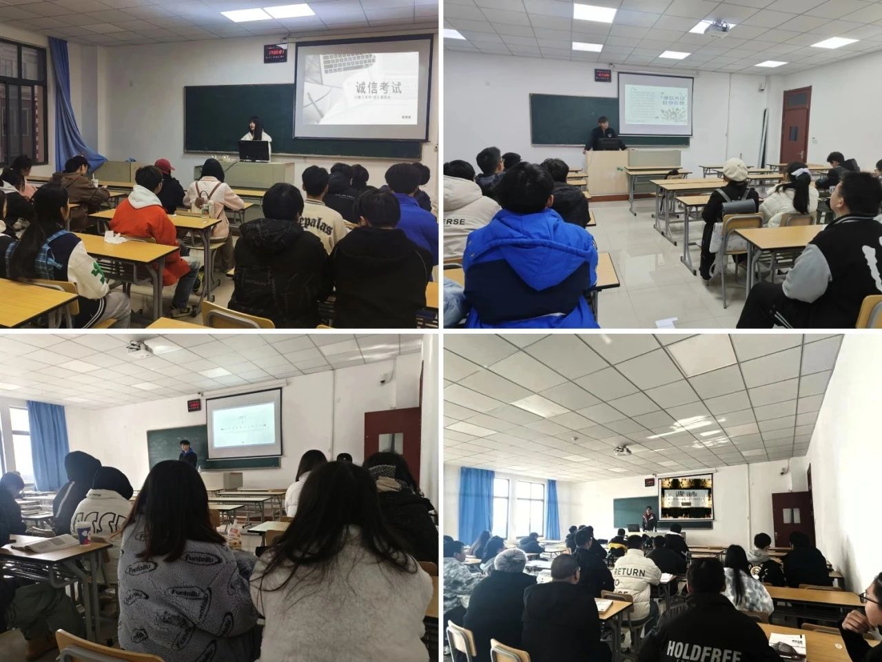 班会上,各班班长说明了各个学科的考试时间,要求同学们做到不迟到、不缺考。在考试过程中禁止抄袭或者协助他人作弊,杜绝任何作弊行为发生。