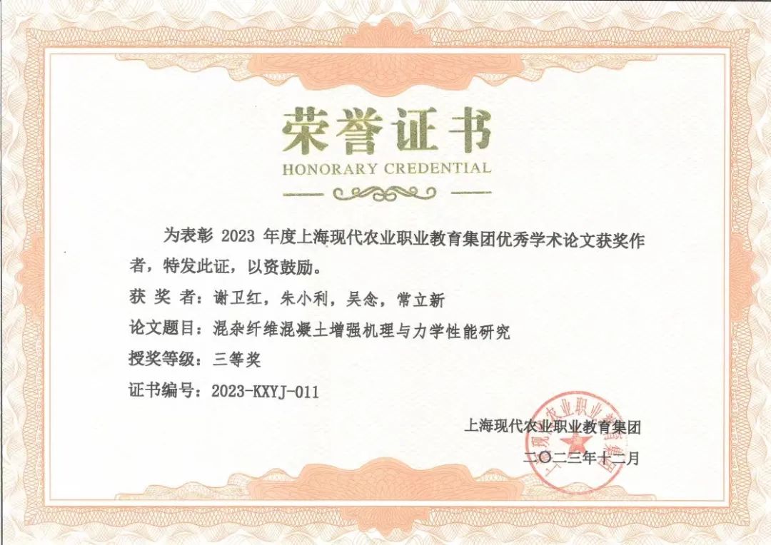 建筑工程学院认真组织、鼓励教师参与本次优秀论文的评奖申报。经专家评审,由朱小利、谢卫红、吴念、常立新四位老师共同编写的《混杂纤维混凝土增强机理与力学性能研究》论文获三等奖。