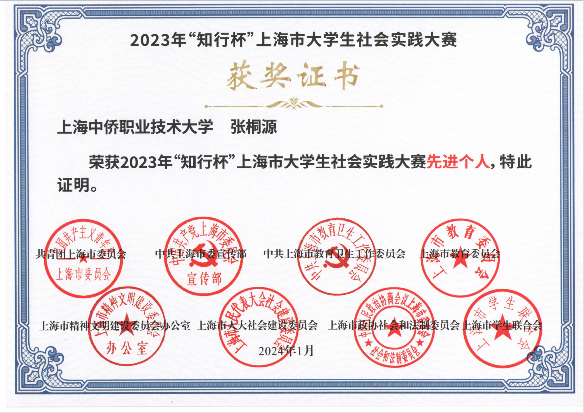 张桐源老师以帮助学生了解所学专业在相关行业中的实际价值,激励和引导青年学子在建设强国的征程中,坚定理想信念,荣获2023年“知行杯”上海市大学生社会实践大赛先进个人奖项。