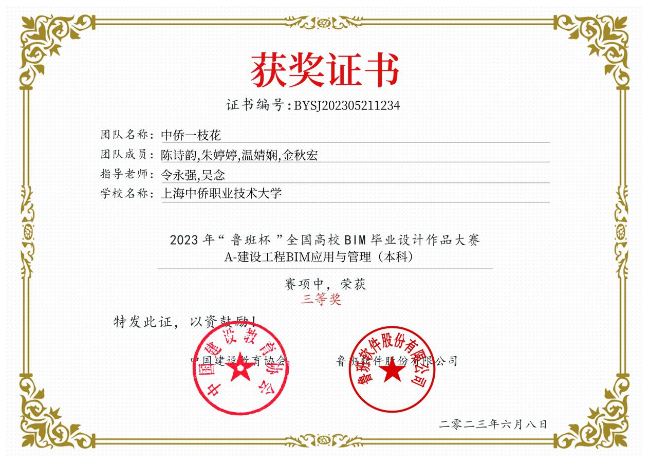 在令永强老师和吴念老师的指导下,中侨一枝花团队荣获A赛道建设工程BIM应用与管理赛项本科组三等奖。