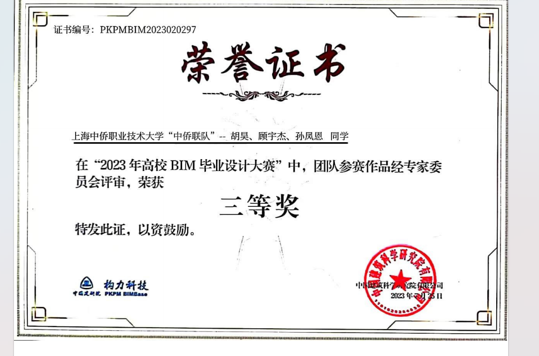 为了深入学习贯彻党的二十大精神,弘扬工匠精神,提高学生的专业技能,培养学生的综合能力,进一步丰富学院文化内涵,加强实践教学环节,使课程教学与技能竞赛结合起来,增强大学生动手能力,培养团队协作精神和细致严谨的科学态度,提高学生BIM设计水平,建筑工程学院积极组织学生参加高校BIM毕业设计大赛,胡昊、顾宇杰、孙凤恩荣获2023年高校BIM毕业设计大赛三等奖。