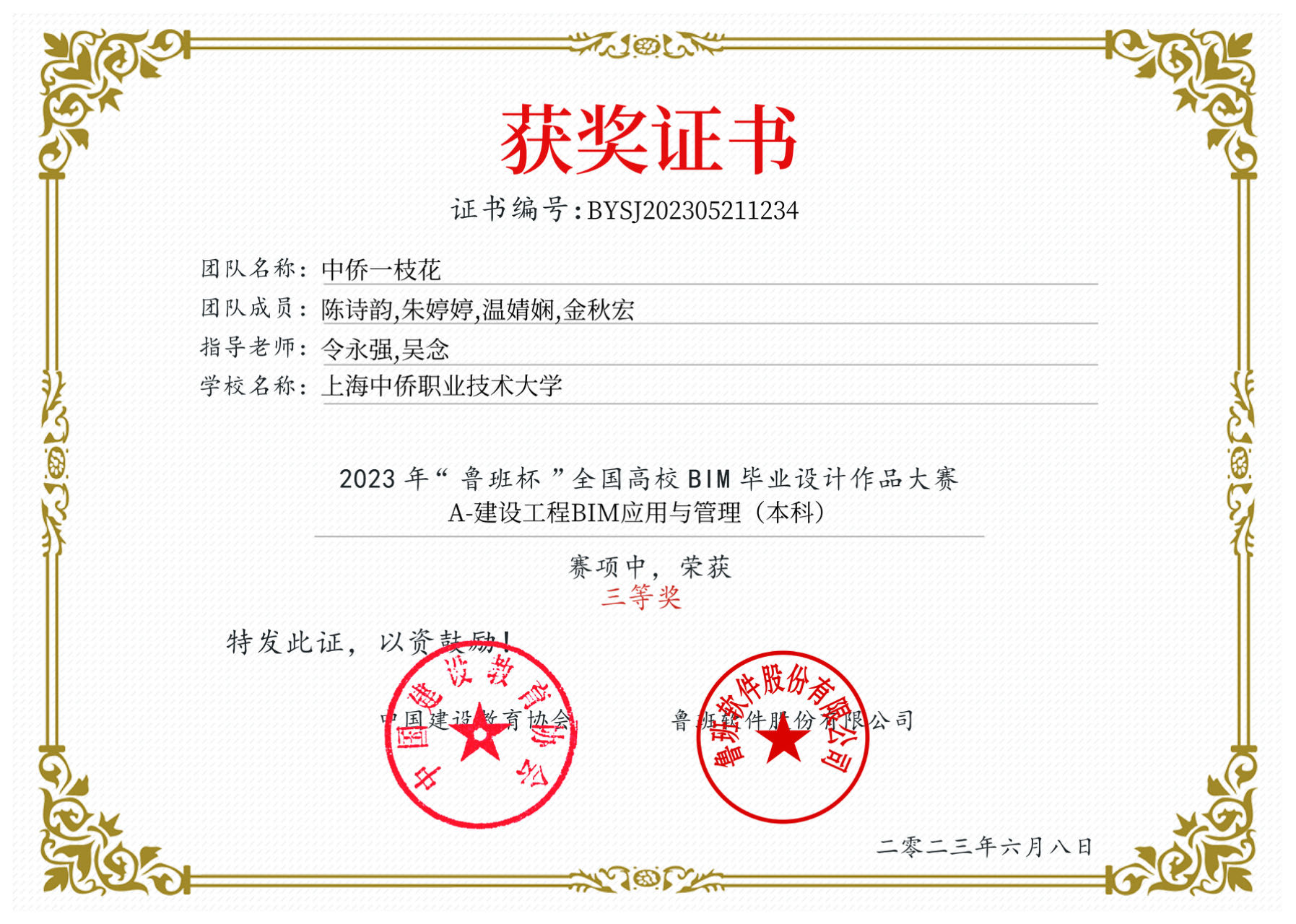 为了深入学习贯彻党的二十大精神,弘扬工匠精神,提高学生的专业技能,培养学生的综合能力,进一步丰富学院文化内涵,加强实践教学环节,使课程教学与技能竞赛结合起来,增强大学生动手能力,培养团队协作精神和细致严谨的科学态度,提高学生BIM设计水平,建筑工程学院积极组织学生参加高校BIM毕业设计大赛,陈诗韵、朱婷婷、温婧娴、金秋宏荣获2023年高校BIM毕业设计大赛三等奖。