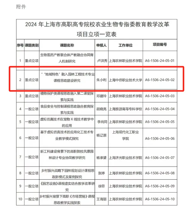 日前,2024 年度上海市高职高专院校农业生物专指委教育教学改革项目立项评审工作已经结束。上海高职高专农业生物类专业教学指导委员会组织专家进行了认真细致的网络评审与现场评审,最终将结果公示。上海中侨职业技术大学建筑工程学院朱小利教授主持的项目《“地域特色”融入园林工程技术专业课程思政建设研究》成功立项。