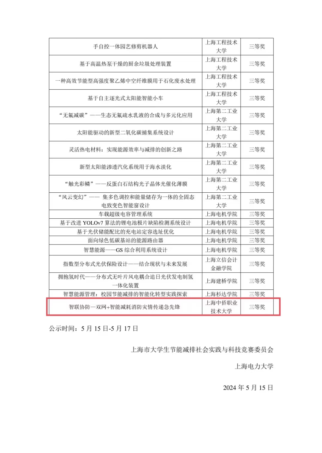 日前,“中天科技杯”第一届上海市大学生节能减排社会实践与科技竞赛落下帷幕。经2024年5月8日至13日专家网络评审,上海市大学生节能减排社会实践与科技竞赛委员会——上海电力大学公布了“中天科技杯”第一届上海市大学生节能减排社会实践与科技竞赛入围决赛及三等奖作品名单。上海中侨职业技术大学建筑工程学院学子《智联协防一双网+智能减耗消防灾情传递急先锋》作品荣获三等奖。