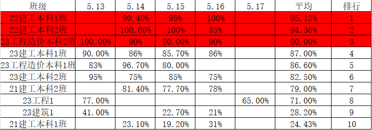 相比上周,整体出勤率有所下降,22建工本科1班成功逆袭第一,22建工本科2班、23工程造价本科2班不甘示弱,挤进前三。让我们期待一下,下周的前三又会是谁。