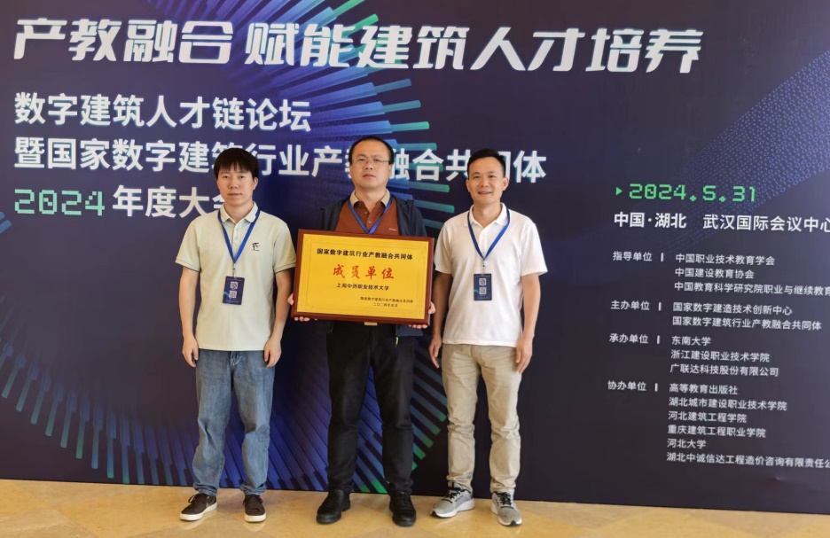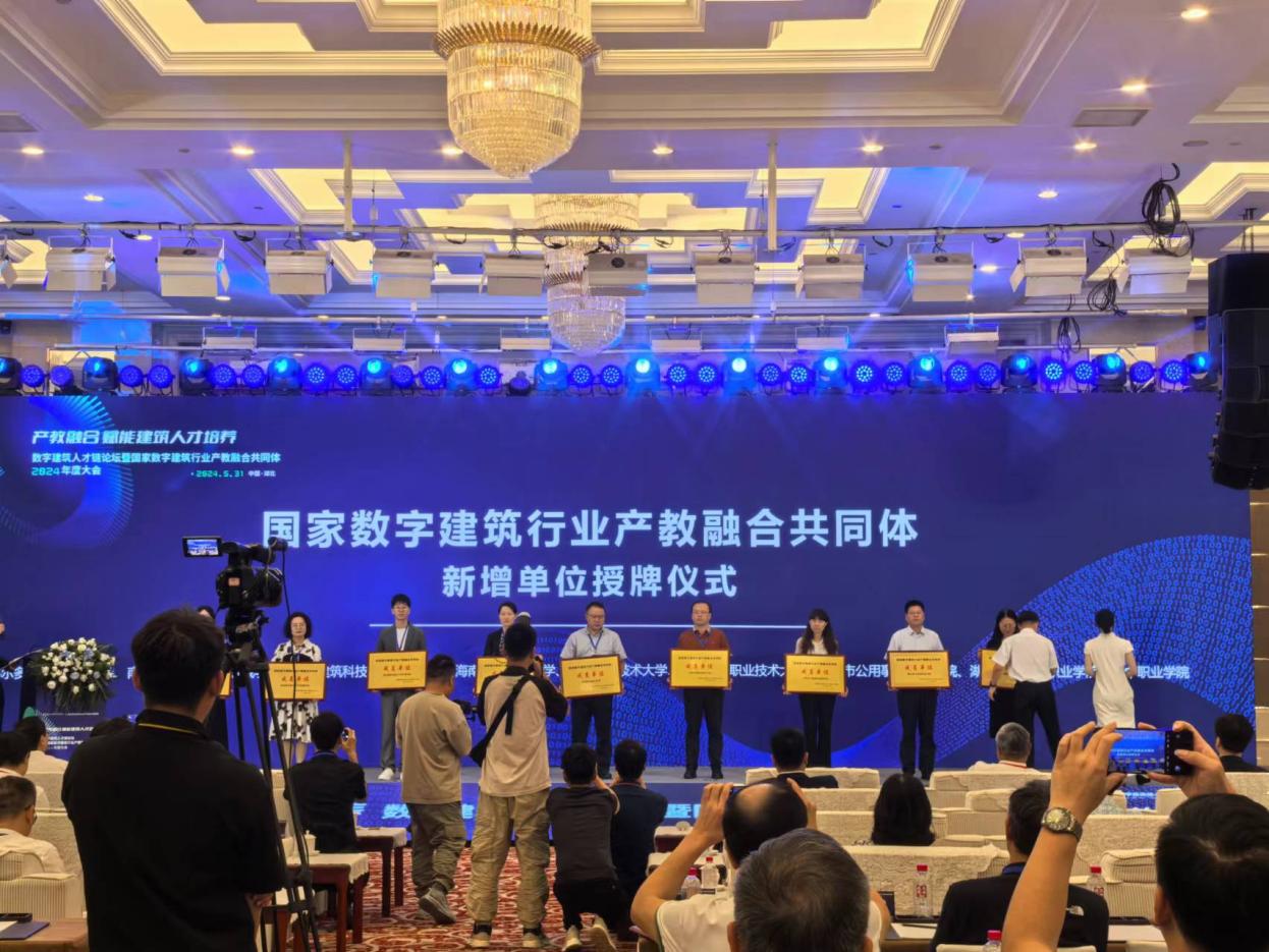 2024年5月31日,由国家数字建造技术创新中心、国家数字建筑行业产教融合共同体主办,由东南大学、浙江建设职业技术学院、广联达科技股份有限公司承办的“数字建筑人才链论坛暨国家数字建筑行业产教融合共同体2024年度大会”在武汉隆重举行。上海中侨职业技术大学作为国家数字建筑行业产教融合共同体新增成员,委派建筑工程学院院长朱小利应邀出席会议并参与授牌仪式。