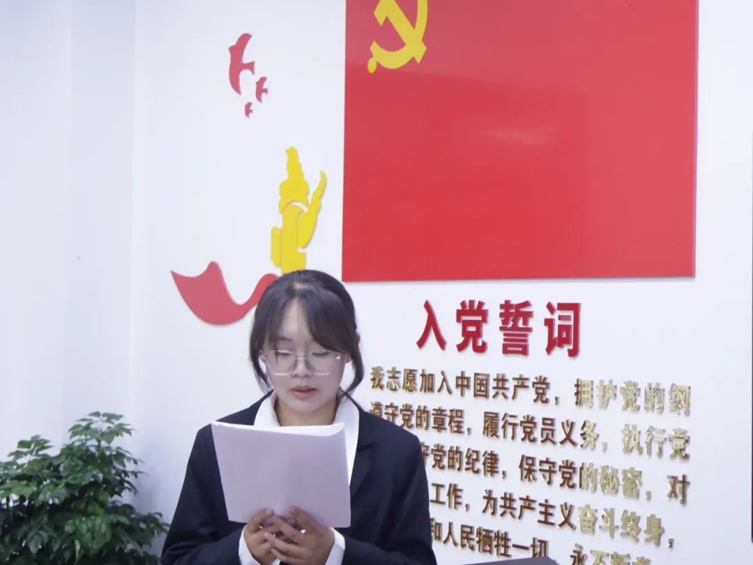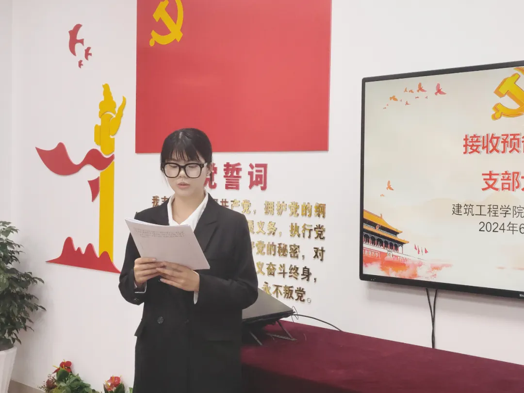 建筑工程学院直属党支部副书记岳建梅带领三名预备党员同志宣读入党誓词。