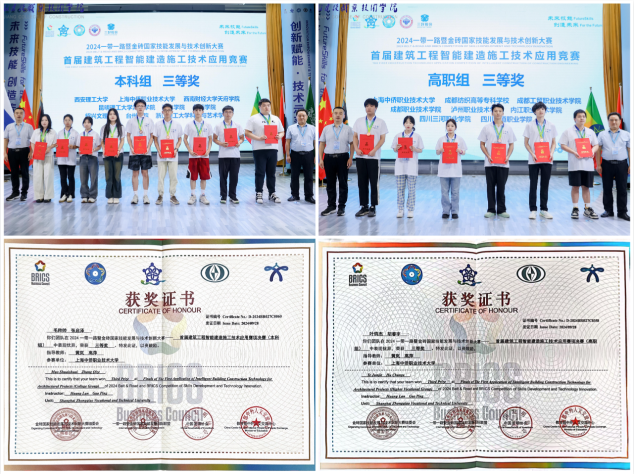 近日,首届建筑工程智能建造施工技术应用赛项决赛圆满落幕。在建筑工程学院建筑工程技术专业主任黄岚、专业教师高萍的悉心指导下,毛帅帅、张启泽同学荣获本科组三等奖,叶钧杰、胡春宇同学荣获高职组三等奖,取得了优异的成绩!