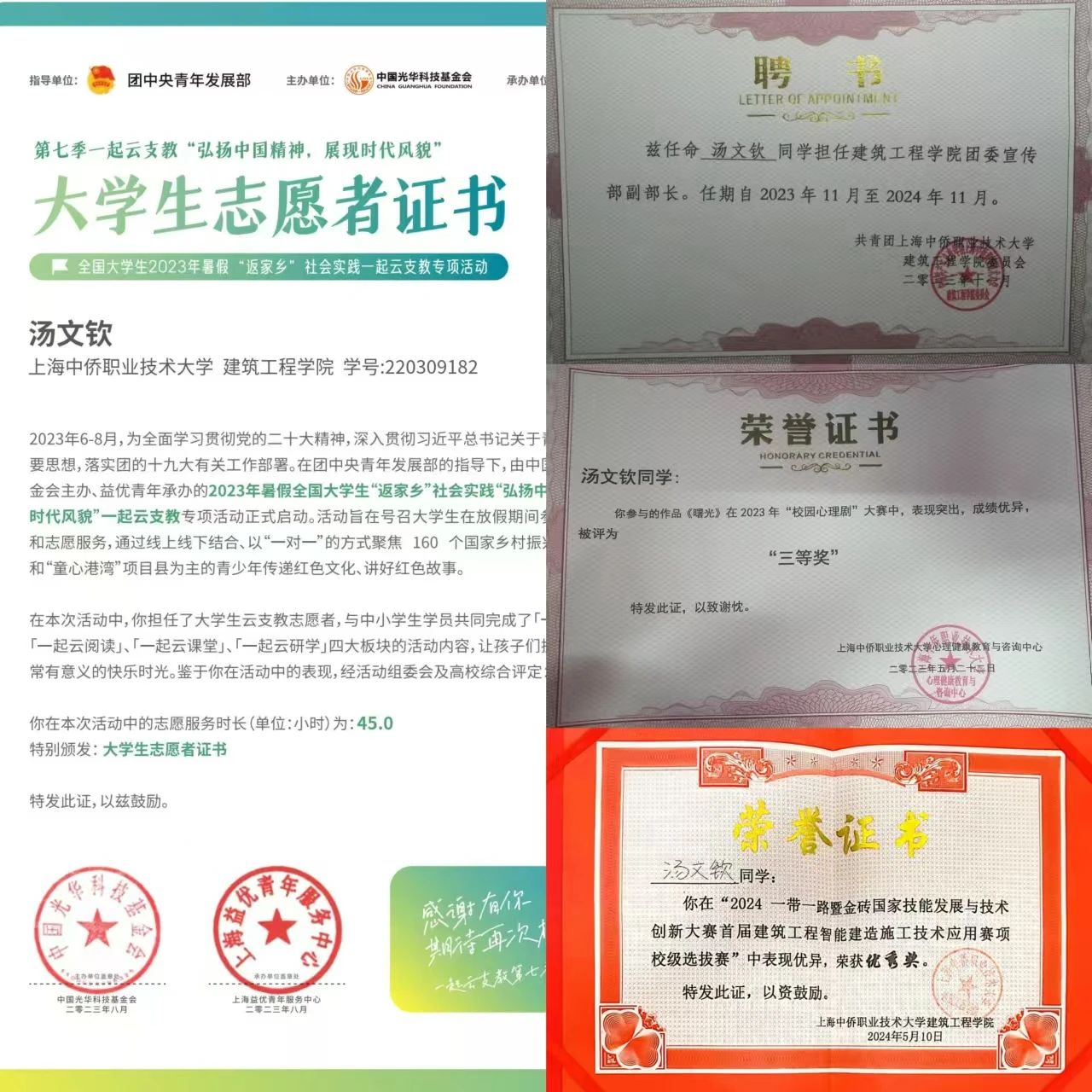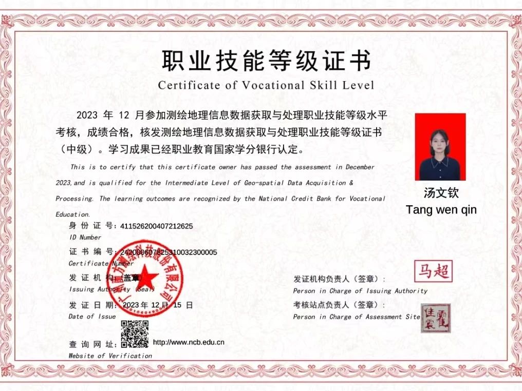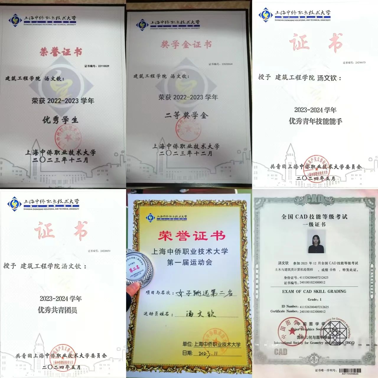 在学习生活上,她始终保持端正、谦虚的学习态度。上课时认真听讲,课后不留疑,紧跟教师的思路走。遇到学习中的困难和挫折,能正确面对,凭借自己的毅力和信心克服困难,保持积极的学习态度。在校期间,汤文钦同学以优异成绩前后荣获学校一等奖学金、二等奖学金,“中天科技杯”三等奖、校优秀学生、校优秀共青团员、校优秀青年技能能手。并积极考取计算机一级证书、“1+X测绘地理信息数据获取与处理”中级证书,CAD证书。积极参加学校组织的各项活动,在学校举办的运动会中,跳远荣获“第二名”的优异成绩。