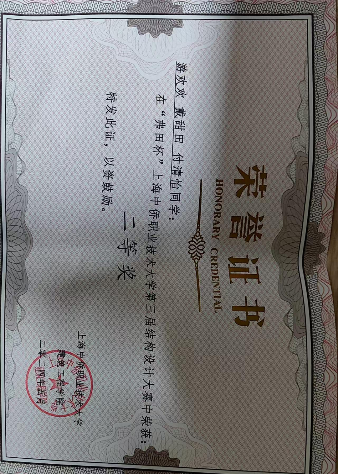 在“弗田杯”上海中侨职业技术大赛第三届结构设计大赛中荣获二等奖