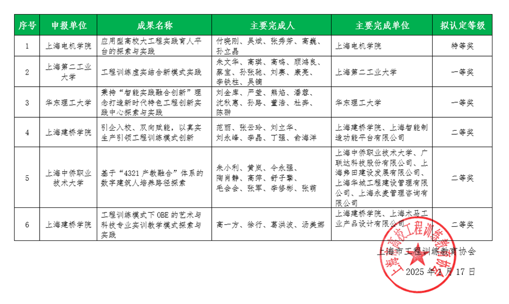 在教育创新与实践的征程中,建筑工程学院又添佳绩!2025年1月18日,从上海市工程训练教育协会传来喜讯,建筑工程学院院长朱小利、陶肖静等教师凭借在教学改革与实践中的突出表现,荣获2024年度上海市工程训练教育协会教学成果奖二等奖。