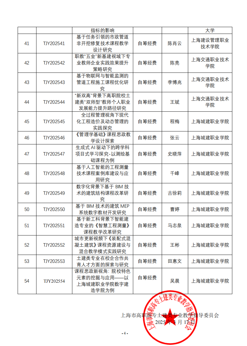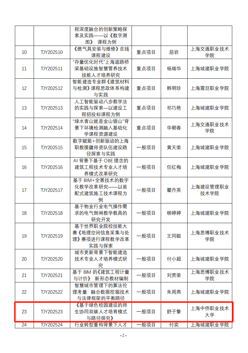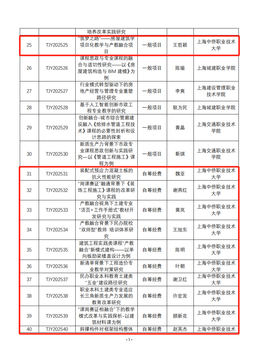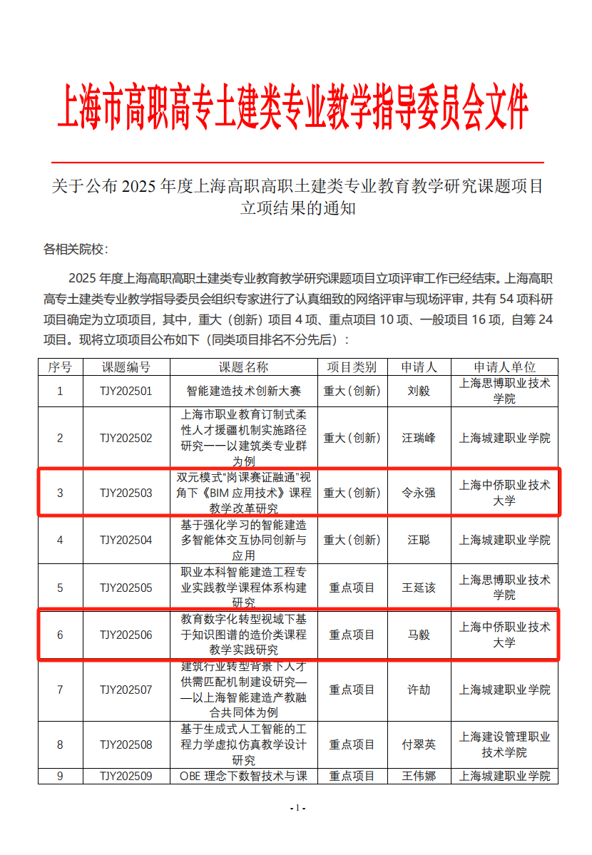 日前,2025 年度上海高职高专土建类专业教育教学研究课题项目立项评审工作已经结束。上海高职高专土建类专业教学指导委员会组织专家进行认真细致的网络评审与现场评审最终将结果公示。上海中侨职业技术大学建筑工程学院多名专业教师项目成功立项,包含重大创新类项目一项、重点项目一项、一般项目两项、自筹经费项目十项。