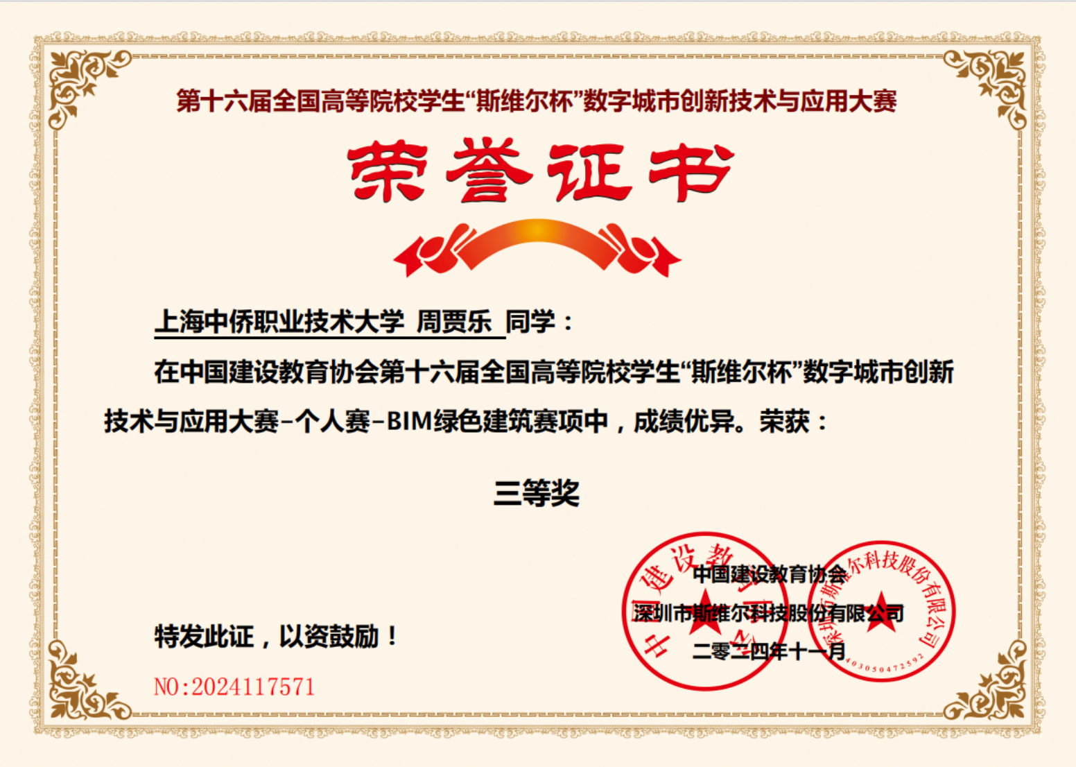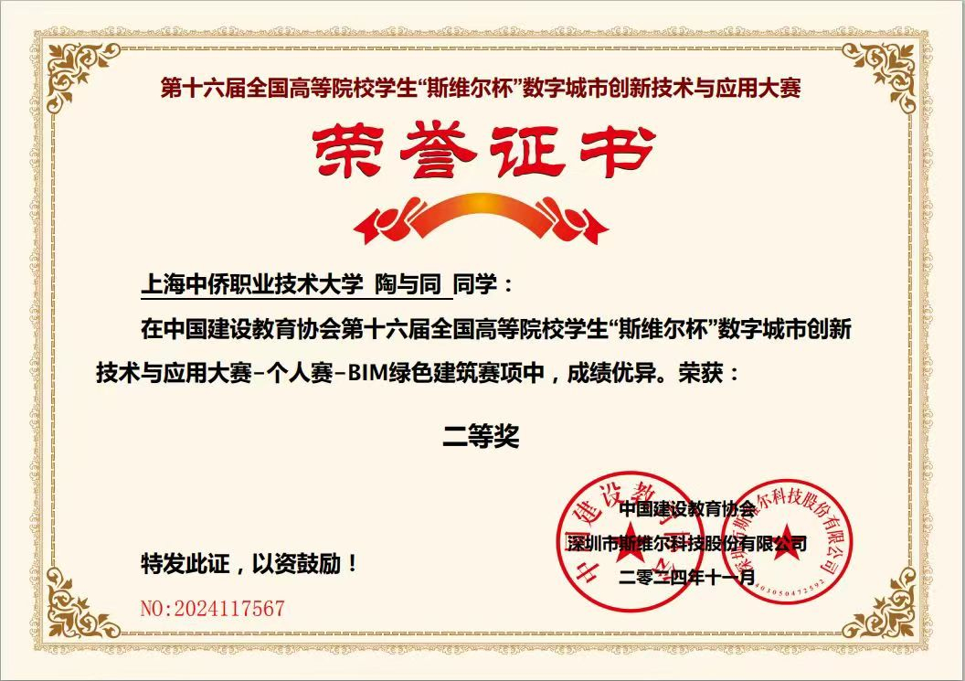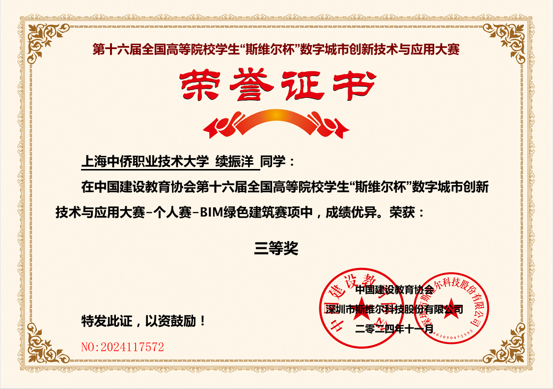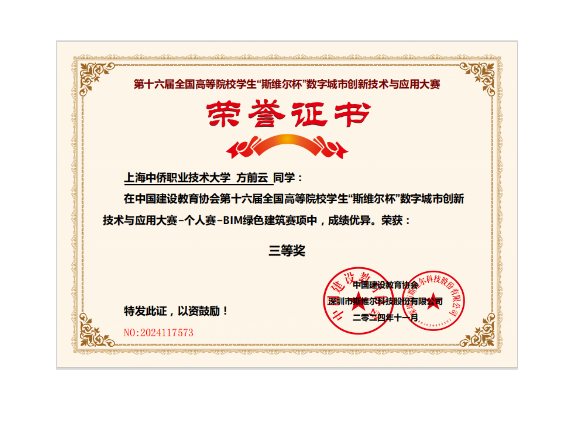 为充分发挥竞赛在促进高技能人才培训、推动开展职业技能培训等方面的重要作用,继续推进BIM、CIM技术在高等院校的教学与应用,深化复合型人才培养。中国建设教育协会举办第十六届全国高等院校学生“斯维尔杯”BIM-CIM创新大赛,建筑工程学院积极参加此次竞赛并获二等奖一项,三等奖一项。