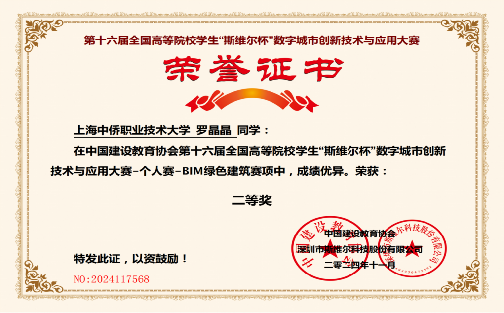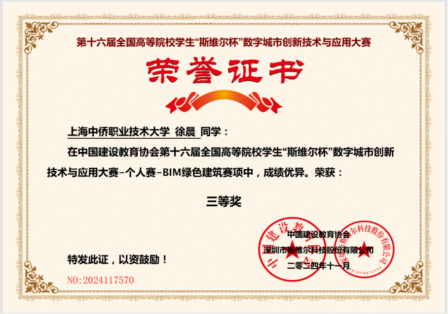 罗晶晶、徐晨、陶与同、孙海伟、续振洋、周贾乐、方前云等同学经过层层选拔,运用丰富的专业知识,在个人赛-BIM绿色建筑赛项中分别荣获二等奖、三等奖。