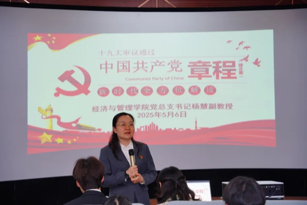 第三项议程,经济与管理学院党总支书记杨慧老师带来中党开班第一课《新时代全方位解读党章》。她结合党史与现实,深入剖析党章的时代内涵,强调党章是党的根本大法,是全体党员的行动纲领。她表示学党章不仅是学条文,更要学精神、学立场、学方法,将党章要求内化于心、外化于行,争做新时代有为青年。