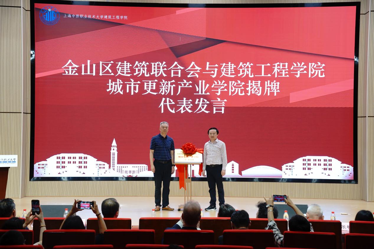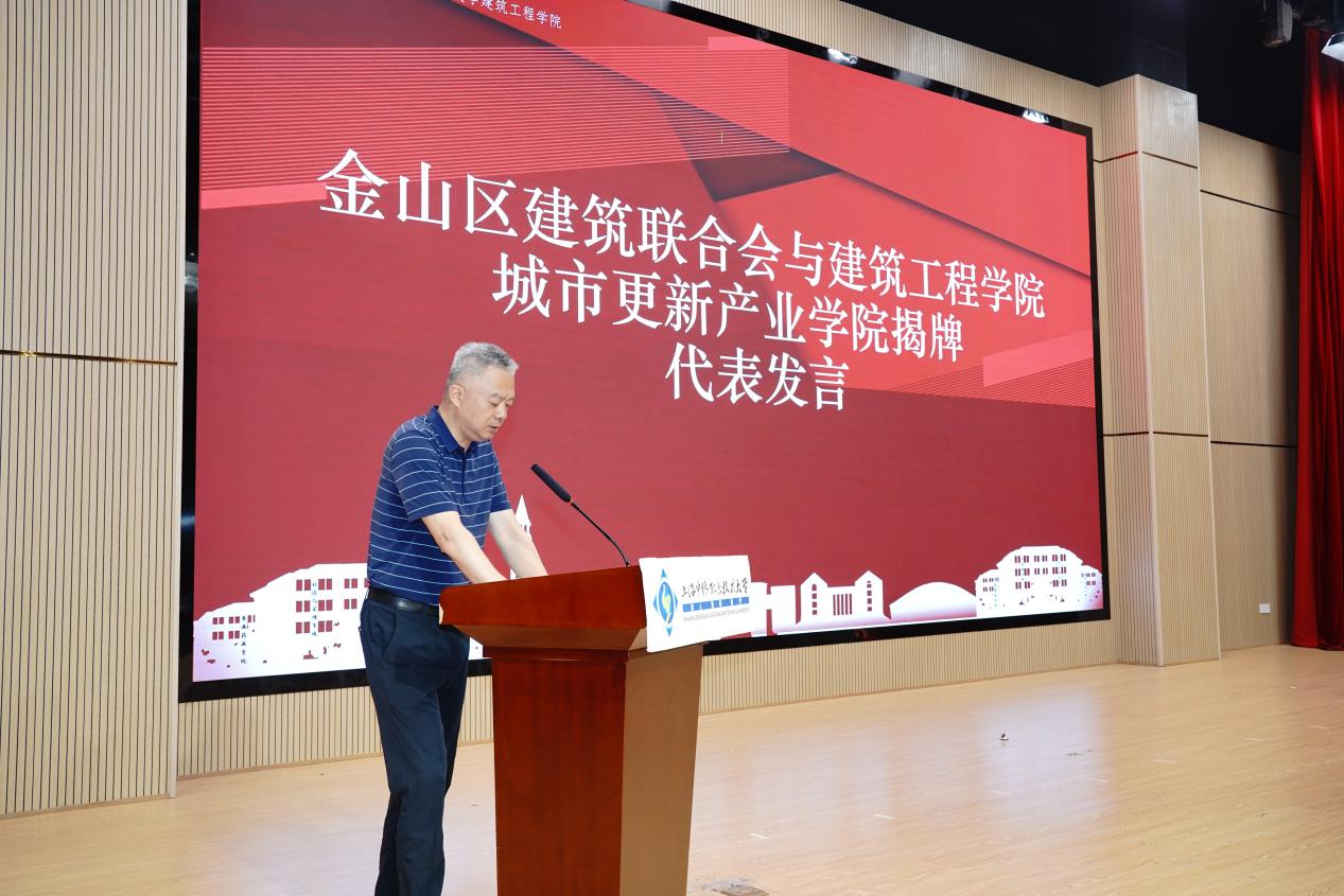 第八项议程,金山区建筑联合会与建筑工程学院城市更新产业学院揭牌并代表发言。金山区建筑协会理事长金辉球表示,城市更新进度稳步推进,建筑行业专业人才需求稳步提升,依托建筑工程学院专业教学水平,为城市更新进度提供专业人才与创新方案。
