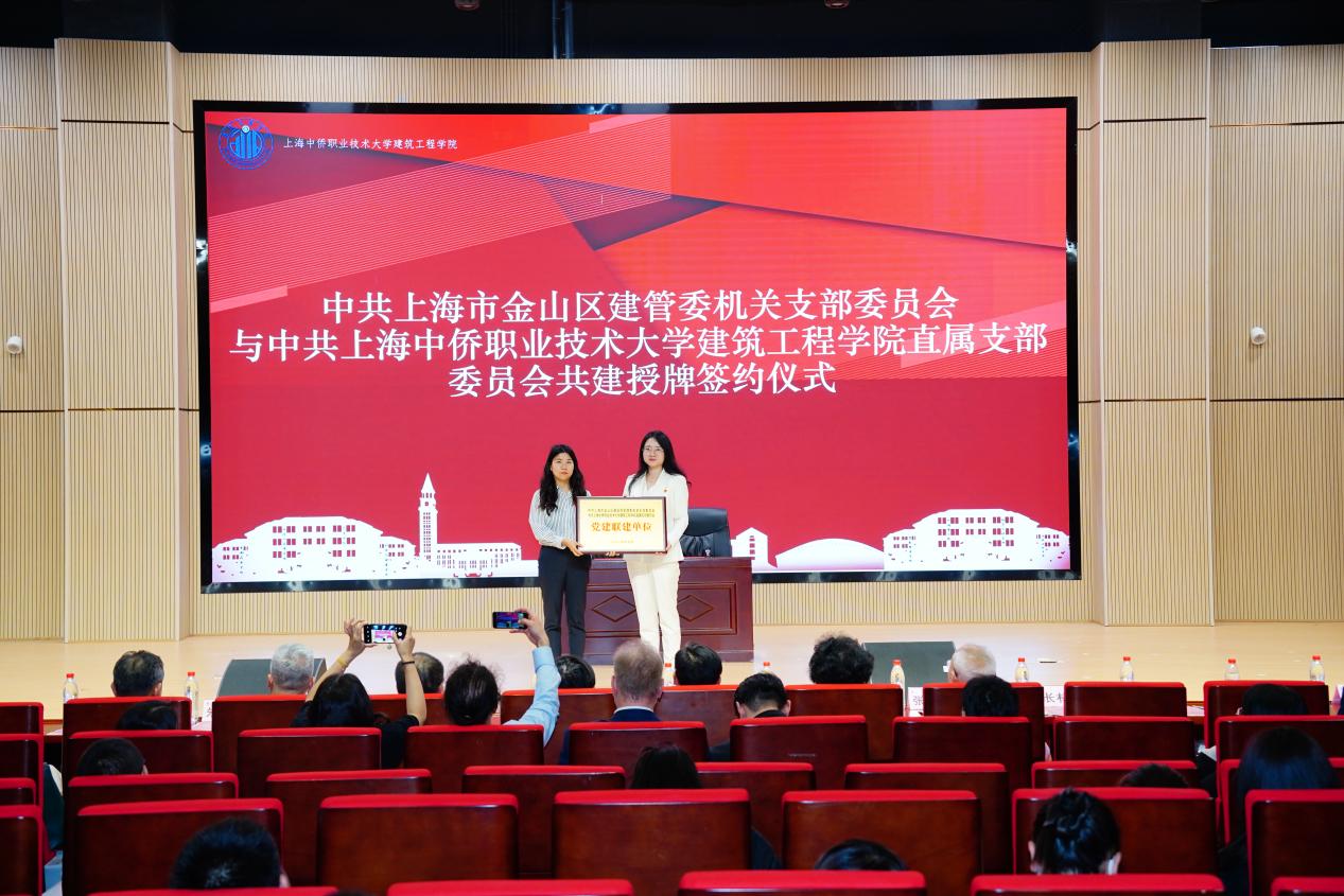 第五项议程,中共上海市金山区建设和管理委员会机关支部委员会与中共上海中侨职业技术大学建筑工程学院直属支部委员会共建仪式并授牌。建筑工程学院直属党支部以党建引领为核心,将组织优势转化为专业动能,搭建青年学子实践平台。通过与金山区建管委共建深化产教融合,推动职业教育高质量发展,共育新时代建设人才。