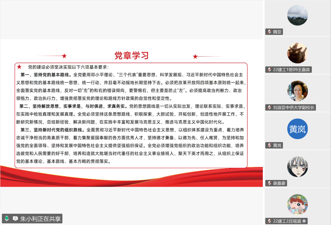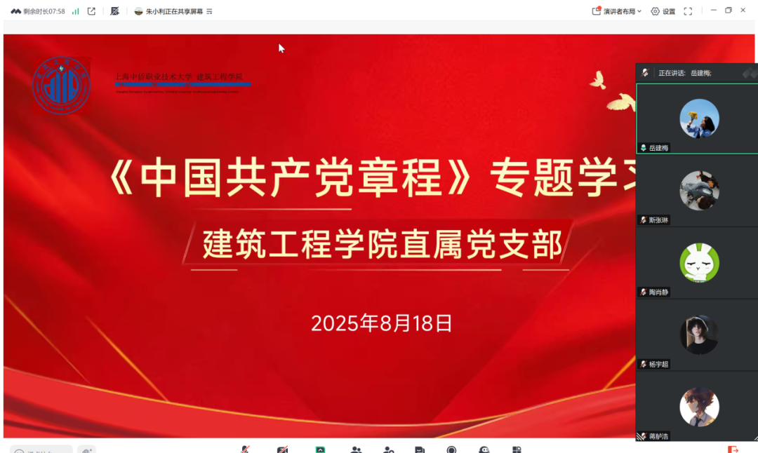 为进一步提升学院党员的政治理论水平和业务工作能力,全力打造一支政治立场坚定、业务能力精湛、综合素质过硬的党员队伍,2025年8月18日上午10:30,建筑工程学院直属党支部召开党章线上学习会。本次会议建筑工程学院直属党支部全体党员参会,由建筑工程学院直属党支部书记朱小利领学《中国共产党章程》,由副书记岳建梅主持。
