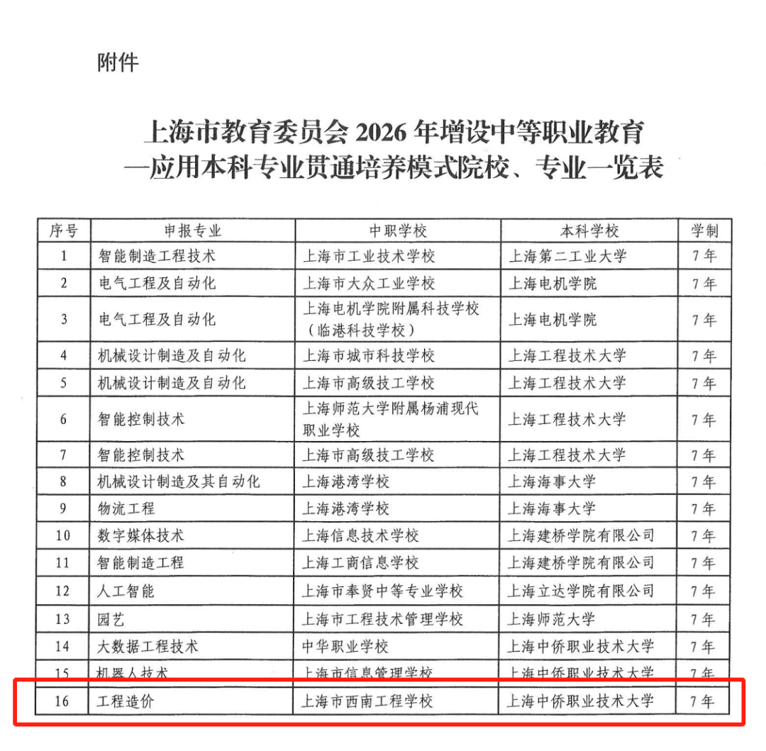 根据上海市教委公布的《2026年增设中等职业教育—应用本科专业贯通培养模式院校、专业一览表》,上海中侨职业技术大学与上海市西南工程学校合作的“工程造价”专业已正式纳入中本贯通培养体系,学制为7年。