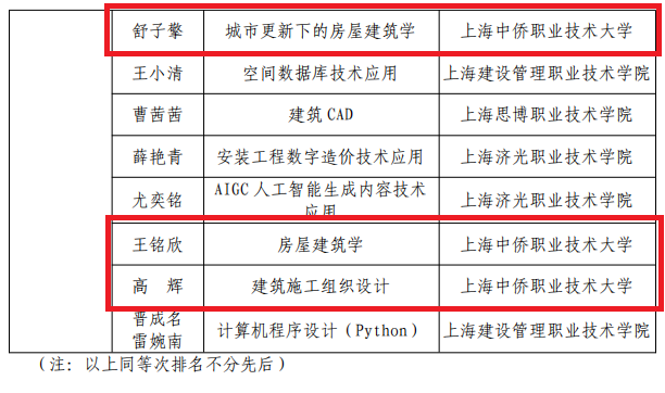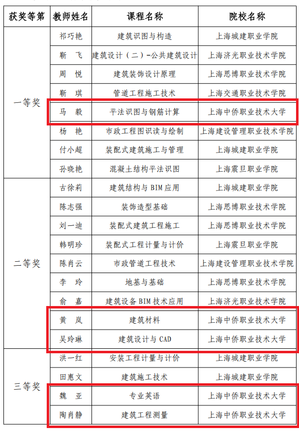 同时上海中侨职业技术大学建筑工程学院马毅老师在优秀课程标准评选中荣获一等奖,建筑工程学院黄岚、吴玲琳两位老师荣获二等奖,建筑工程学院魏亚、陶肖静、舒子擎、王铭欣、高辉五位老师荣获三等奖。