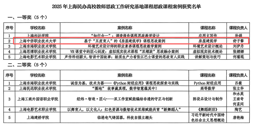 近日,由上海民办高校教师思政工作研究基地开展的2025年课程思政课程案例征集活动评选结果正式揭晓。上海中侨职业技术大学建筑工程学院专业主任舒子擎与专业老师高萍凭借在教学创新与课程改革中的突出表现,分别荣获一等奖和优秀奖,充分展现了学院教师扎实的教学能力与积极进取的育人风采。