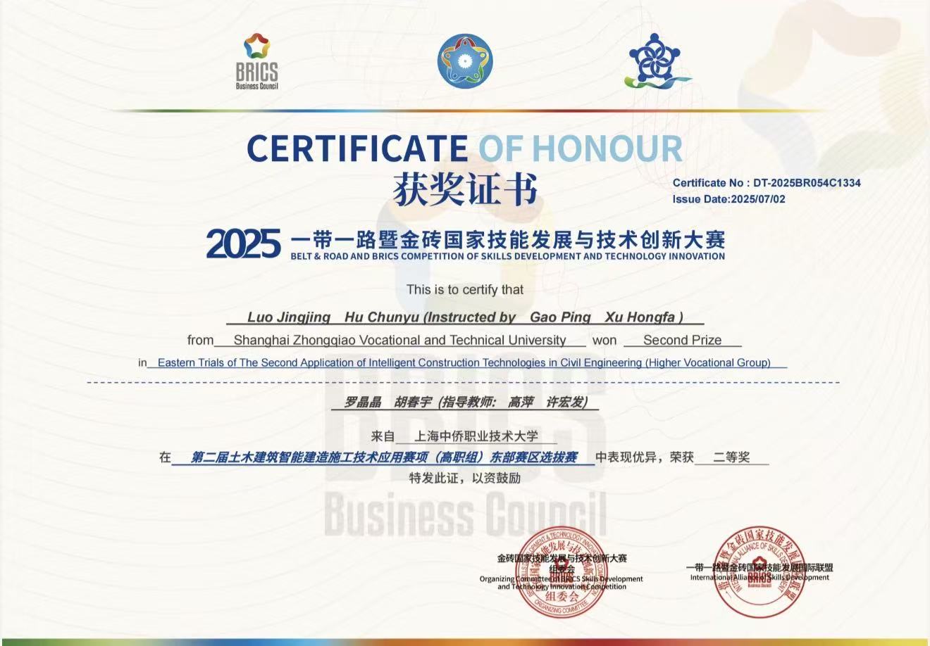 在本次大赛中,由建筑工程学院专业老师高萍、教授许宏发指导,罗晶晶、胡春宇同学组成的参赛团队,代表上海中侨职业技术大学参加2025一带一路暨金砖国家技能发展与技术创新大赛。在第二届土木建筑智能建造施工技术应用赛项(高职组)东部赛区选拔赛中,团队凭借精准的专业应用与高效的团队协作,在激烈角逐中脱颖而出,荣获二等奖。